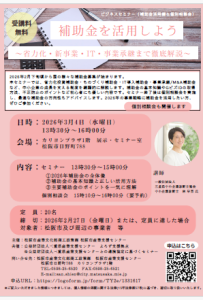 本セミナーでは、省力化投資補助金・ものづくり補助金・IT導入補助金・事業承継/M&A補助金など、中小企業の成長を支える制度を網羅的に解説いたします。 補助金の基本知識やGビズIDの取得方法、不正防止のポイントなど初心者にも優しい内容です。 セミナー終了後は個別相談会を実施し、最適な補助金の方向性もアドバイスします。 2026年の事業戦略に補助金を活用したい方、ぜひ ご参加ください。